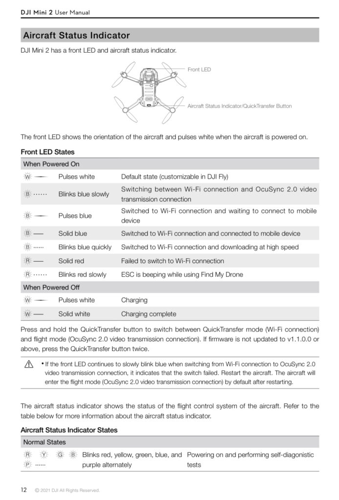 The front LED shows the orientation of the aircraft and pulses white when the aircraft is powered on. Front LED States |